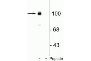 - Specific for the ~102 kDa mGluR7 protein phosphorylated at Ser862. Immunolabeling is blocked by preadsorption of antibody with the phospho-peptide used as antigen but not by the corresponding dephosphopeptide.