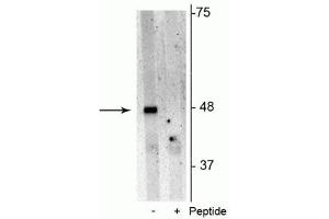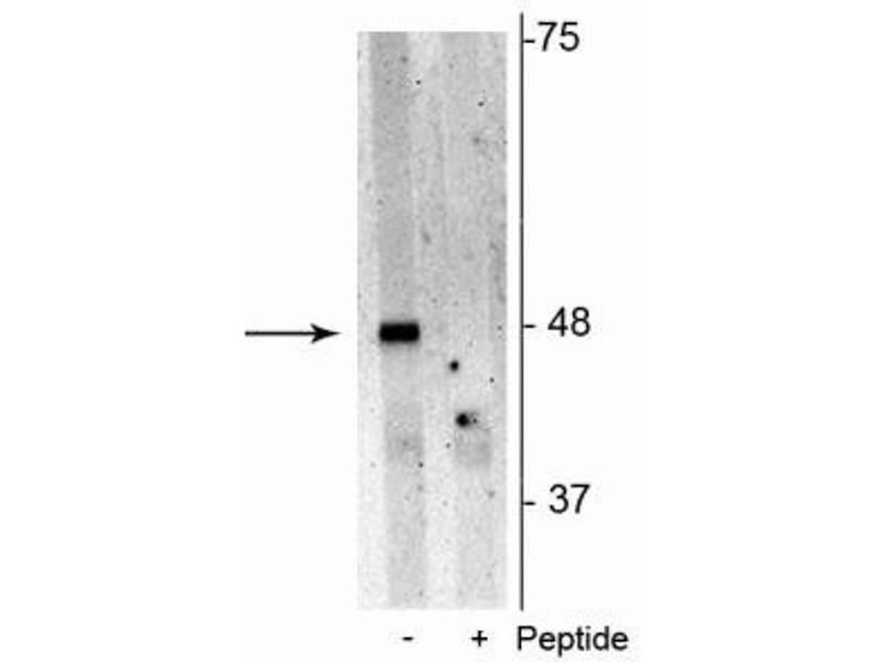 Specific for endogenous levels of the ~48 kDa p62 protein phosphorylated at Ser28. Immunolabeling is blocked by preadsorption with the phosphopeptide used as antigen, but not by the corresponding non-phosphopeptide.