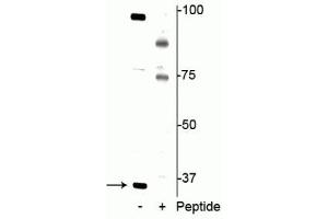 - Specific for endogenous levels of the ~34 kDa REDD1 phosphorylated at Thr23/25. Immunolabeling is blocked by preadsorption with the phosphopeptide used as antigen, but not by the corresponding non-phosphopeptide.