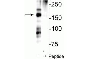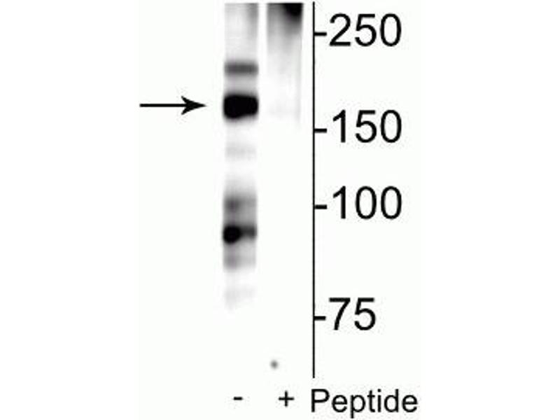 - Specific for endogenous levels of the ~180 kDa NMDAR NR2B subunit phosphorylated at Ser1166. Immunolabeling is blocked by preadsorption with the phosphopeptide used as antigen, but not by the corresponding non-phosphopeptide.