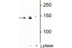 - Specific for endogenous levels of the ~142 kDa DENND3 phosphorylated at Ser554. The immunolabeling is completely eliminated by treatment with λ-phosphatase.