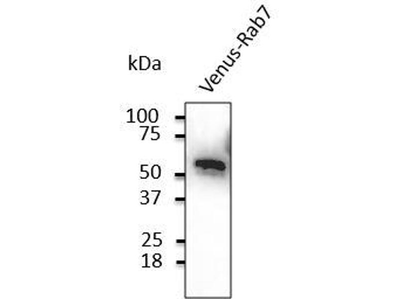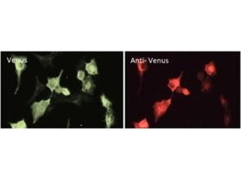 In 293HEK cells transfected with cds plasmid detects a band of 27 kDa by Western blot. This antibody also recognizes Venus/GFP and does not cross-react to mCherry/red fluorescent proteins.