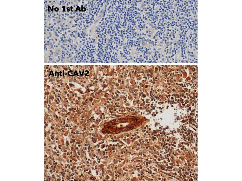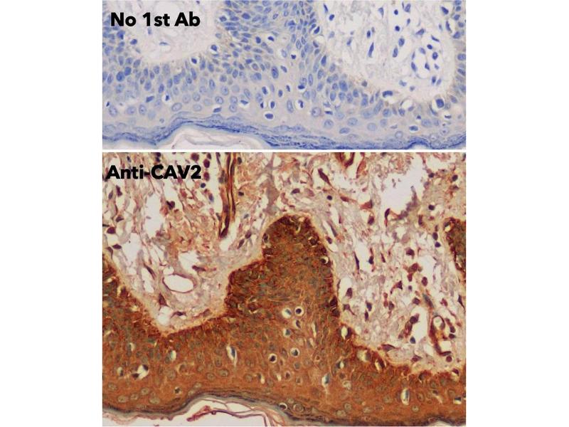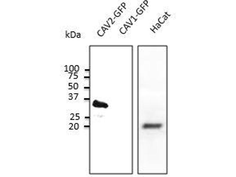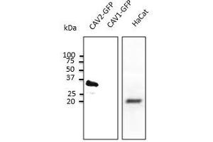 - Detects a band of approximately 20 kDa by Western blot in HaCat cell lysate and 45 kDa CAV2-GFP transfected cell lysate. This Ab does not recognize CAV1.