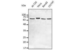 - Detects a band of 65-70 kDa by Western blot in whole cell lysates.