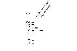 - In 293HEK cells transfected with cds plasmid (myc-his-Mutyh) detects a band of 50 kDa by Western blot.