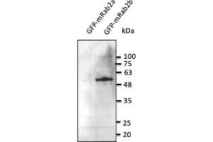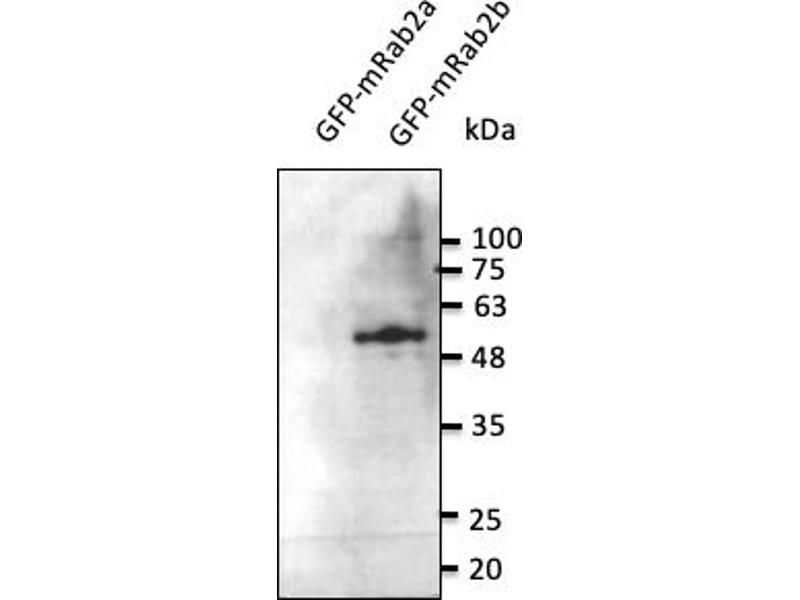 - Detects levels of Rab2b protein in transfected cells with GFP-Rab2b by Western blot. This antibody is specific for Rab2b and it barely detects Rab2a.