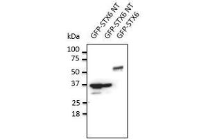- Detects STX6 by Western blot in transfected cells with GFP-STX6.