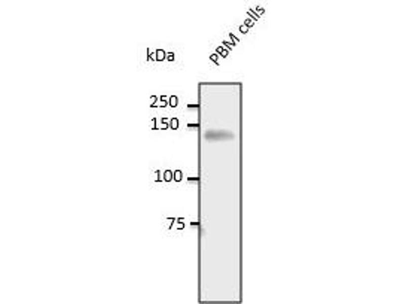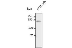Using PBM cell lysates detects a 130-140 kDa band by Western blot.