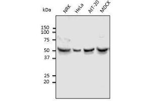 - This antibody gives a positive signal in the following human (HeLa), rat (NRK), mouse (AtT-20), dog (MDCK) whole cell lysates.
