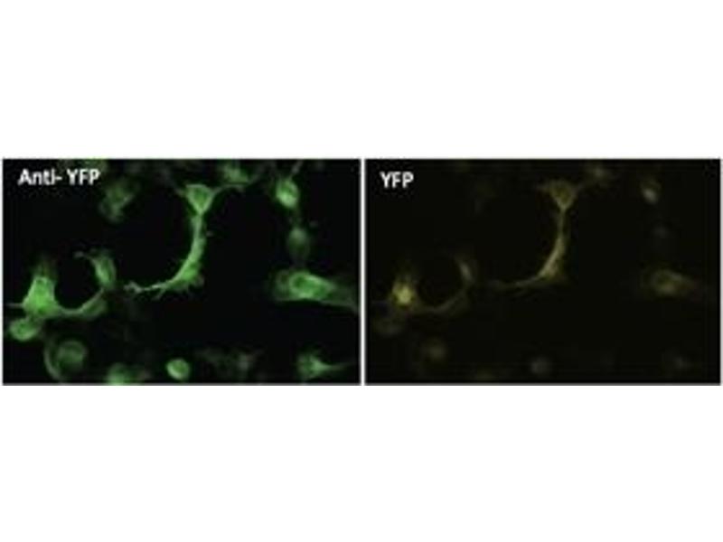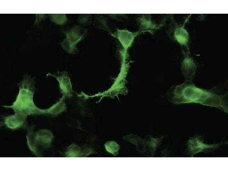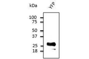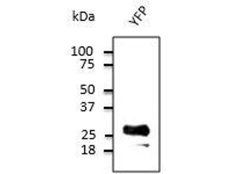 In 293HEK cells transfected with cds plasmid detects a band of 27 kDa by Western blot. This antibody also recognizes GFP and does not recognize mCherry/red fluorescent protein.