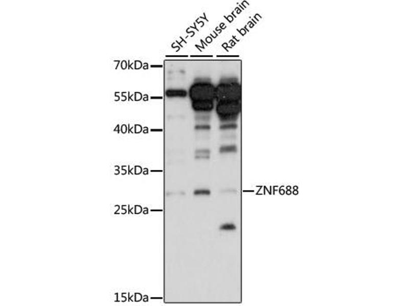 This Rabbit Polyclonal antibody specifically detects ZNF688 in WB. It exhibits reactivity toward Human, Mouse and Rat.