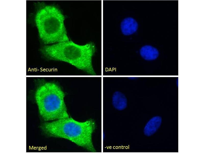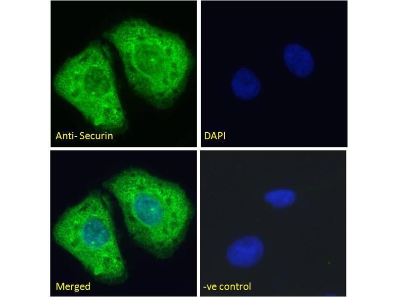 Immunofluorescence: Strong expression of the protein seen in the cytoplasm of HeLa and U2OS cells. Recommended concentration: 10μg/ml.
