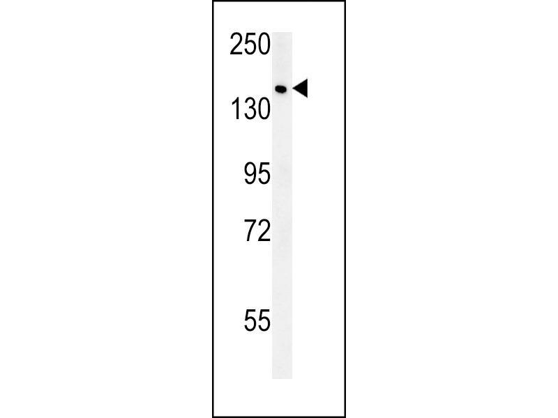 This SAMD9 antibody is generated from rabbits immunized with a KLH conjugated synthetic peptide between 1165-1193 amino acids from the C-terminal region of human SAMD9.