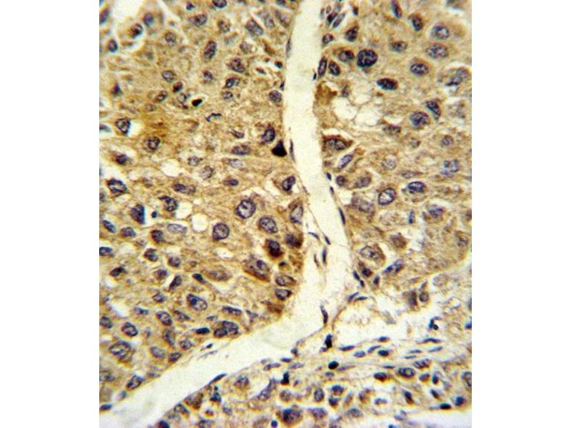 This NOS3 antibody is generated from rabbits immunized with a KLH conjugated synthetic peptide between 48-75 amino acids from the N-terminal region of human NOS3.