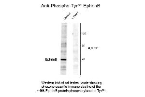 Background: EphrinB Antibody detects EphrinB proteins which are thought to play key roles in cellular functions as diverse as neuronal migration and blood vessel development. EphrinB molecules expressed at the membrane surface bind to the EphB family receptors on target cells during cell-to cell contact. This interaction leads to cell signaling in the target cell but also generates a reverse signal in the cell expressing EphrinB on its surface. This reverse signaling event is thought to be critical for vessel maturation and neuronal development. Importantly, tyrosine phosphorylation of EphrinB is thought to be a critical component of this reverse signaling event. Recent work suggests that phosphorylation of a specific EphrinB residue (Tyr298) plays a key role in EphrinB signaling. Anti-EphrinB pT298 Antibody is ideal for investigators involved in Cell Migration, Cell Division, Cell Signaling and Neuroscience.