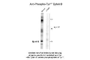 Background: EphrinB Antibody detects rat EphrinB. recognizes EphrinB proteins which are thought to play key roles in cellular functions as diverse as neuronal migration and blood vessel development. EphrinB molecules expressed at the membrane surface bind to the EphB family receptors on target cells during cell-to cell contact. This interaction leads to cell signaling in the target cell but also generates a reverse signal in the cell expressing EphrinB on its surface. This reverse signaling event is thought to be critical for vessel maturation and neuronal development. Importantly, tyrosine phosphorylation of EphrinB is thought to be a critical component of this reverse signaling event. Recent work suggests that phosphorylation of a specific EphrinB residue (Tyr298) plays a key role in EphrinB signaling. Anti-EphrinB pY317 Antibody is ideal for investigators involved in Cell Migration, Cell Division, Cell Signaling and Neuroscience.