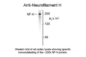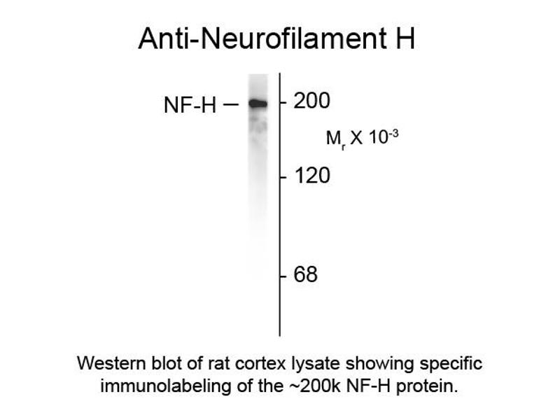 Background: NF-H antibody detects Neurofilament H. Neurofilaments are the 10nm or intermediate filament proteins found specifically in neurons, and are composed predominantly of three major proteins called NF-L, NF-M and NF-H. NF-H is the neurofilament high or heavy molecular weight polypeptide and runs on SDS-PAGE gels at 200-220 kDa, with some variability across species boundaries. Antibodies to NF-H are useful for identifying neuronal cells and their processes in tissue sections and in tissue culture. NF-H antibodies can also be useful to visualize neurofilament accumulations seen in many neurological diseases, such as Amyotrophic Lateral Sclerosis (Lou Gehrig's disease) and Alzheimer's disease. Anti-Neurofilament H antibody is ideal for investigators involved in Cell Signaling, and Neuroscience research.