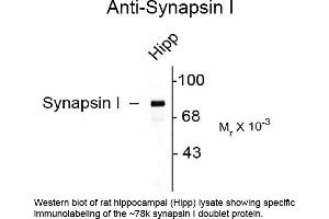 Anti-Synapsin I antibody has been tested in Western Blotting. Expect ~78kDa. Specific conditions for reactivity should be optimized by the end user.