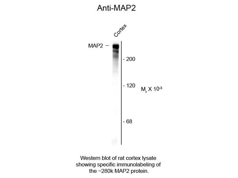 Anti-Microtubule Associated Protein 2 antibody is tested for use in Western Blotting, ICC, and IHC. Specific conditions should be optimized by the end user. Expect a band of approximately 280 kDa in size corresponding to MAP2 proteins in Western blots in the appropriate cell lysate or extract.