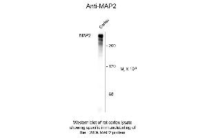 Background: MAP2 antibody detects Microtubule Associated Protein 2. Microtubules are 25nm diameter protein rods found in most kinds of eukaryotic cells. They are polymerized from a dimeric subunit made of one a subunit and one b tubulin subunit. Microtubules are associated with a family of proteins called microtubule associated proteins (MAPs), which includes the protein τ (tau) and a group of proteins referred to as MAP1, MAP2, MAP3, MAP4 and MAP5. MAP2 is made up of two ~280 kDa apparent molecular weight bands referred to as MAP2a and MAP2b. A third lower molecular weight form, usually called MAP2c, corresponds to a pair of protein bands running at ~70 kDa on SDS-PAGE gels. All these MAP2 forms are derived from a single gene by alternate transcription, and all share a C-terminal sequence which includes either three or four microtubule binding peptide sequences, which are very similar to those found in the related microtubule binding protein τ (tau). MAP2 isoforms are expressed only in neuronal cells and specifically in the perikarya and dendrites of these cells. MAP2 has been recently shown to be the specific receptor for the neurosteroid pregnenolone.