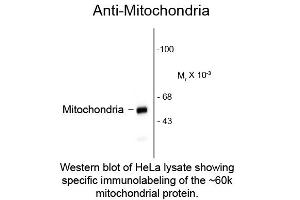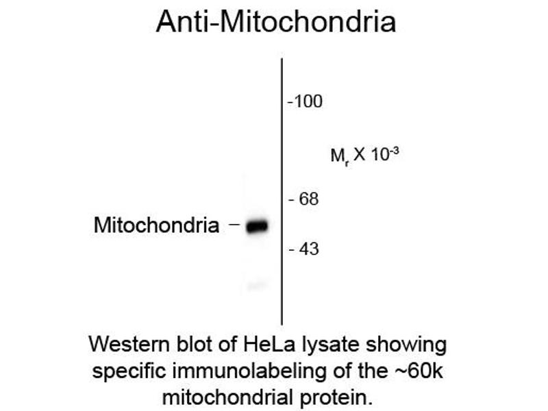 Anti-Mitochondria antibody is tested for use in Western Blotting, IHC and IF. Expect ~60kDa in WB. Anti-Anti-Mitochondria antibody works on acetone fixed and 2% paraformaldehyde fixed cells. The antibody also works for immunohistochemistry on 2% paraformaldehyde fixed cryostat sections. Specific conditions for reactivity should be optimized by the end user.