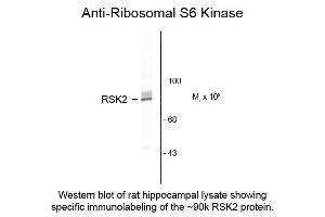 Anti-p90 RSK2 Antibody is tested for use in Western Blotting. Specific conditions for reactivity should be optimized by the end user. Expect a band of approximately 90 kDa in size corresponding to the RSK protein in the appropriate cell lysate or extract.