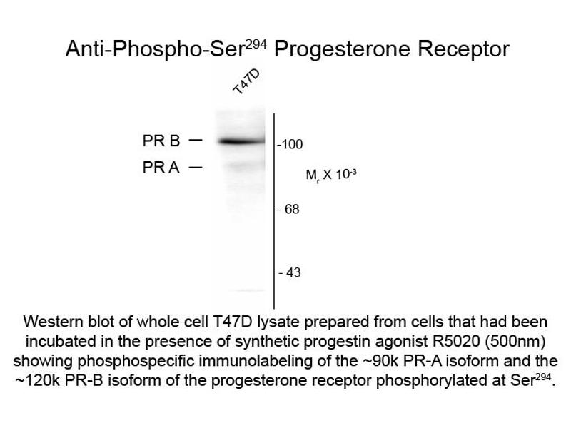 - Anti-Progesterone Receptor pS294 (Mouse) Monoclonal Antibody is Protein G purified from cell culture supernatant. Immunolabeling is blocked by the phosphopeptide used as the antigen but not by the corresponding dephosphopeptide.