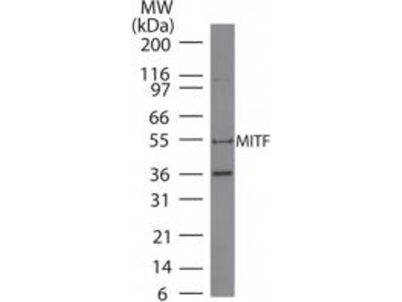 Background: Anti-MITF antibody detects human MITF. Microphthalmia-associated bHLH-LZ transcription factor (MITF) is a positively acting transcription factor containing a transcription activation domain and a bHLH-LZ domain that mediates DNA-binding and dimerization. Both the transcription activation and bHLH-LZ domains are highly conserved in the closely related TFE3, TFEB and TFEC. MITF can form heterodimers in vitro with the above transcription factors, but not with other bHLH-LZ factors such as Myc, Max or USF. MITF is expressed as multiple isoforms, which share common activation and DNA-binding domains, but differ in the amino-terminal region. MITF is targeted by three kinases: GSK-3beta, Map kinase ERK2 and members of the p90 Rsk family of kinases. Anti-MITF antibody is ideal for investigators involved in kinase, phosphatase, NFkappaB, and signaling research.