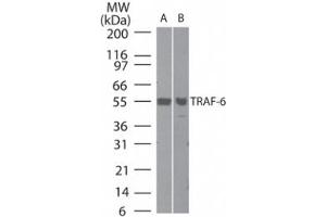 - TRAF6 Antibody was produced from whole rabbit serum prepared by repeated immunizations with a peptide corresponding to an internal amino acid sequence in the human protein TRAF6.