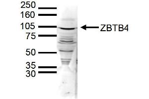 Anti-ZBTB4 Antibody has been tested by ELISA and Western Blots. Specific conditions for reactivity should be optimized by the end user. Expect a band approximately 105 kDa in the appropriate cell lysate or extract.