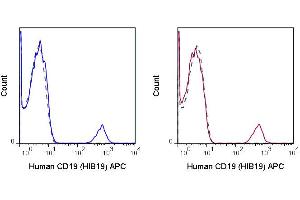 Background: The HIB19 antibody reacts with human CD19, 95 kDa glycoprotein which acts as a co-receptor, along with CD21, CD81 and CD225, in support of the functional B cell receptor (BCR). This complex provides antigen-specific recognition and subsequent activation of B cells to proliferate and differentiate into antibody-secreting cells (plasma cells) or memory B cells, which are crucial for secondary antigen encounter. CD19 is a lineage-differentiation marker, as its expression is detectable at the earliest B cell stages, through development, and is finally lost upon transition to mature plasma cells.The HIB19 antibody is widely used as a phenotypic marker for CD19 expression on B cells, as well as on dendritic cell subsets.