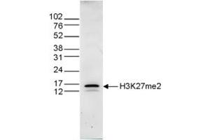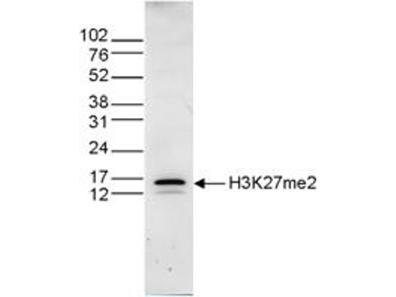 Anti-H3K27me2 Antibody is tested in Chromatin Immunoprecipitation, Dot Blot, ELISA, Immunofluorescence, and Western Blots. Specific conditions for reactivity should be optimized by the end user. Expect a band approximately 17 kDa in the appropriate cell lysate or extract.