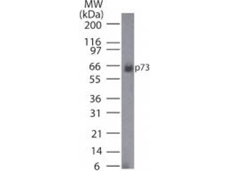 Background: Anti-p73 antibody detects human p73. p73 was identified as a long-lost cousin of tumor suppressor protein, p53. p73 has high homology with p53 as well as with p63, a gene implicated in the maintenance of epithelial stem cells. Significant homology between p53, p63, and p73 (approximately 63 % amino acid identity in the DNA-binding domain suggest that they may have overlapping functions in the regulation of gene expression. The targeted disruption of p73 gene leads to defects hippocampal dysgenesis, hydrocephalus, chronic inflammation and infections. Recently, spilicing variant mRNAs of p73 has been identified in MCF-7, a breast carcinoma cell line. These mRNAs code for variant p73 proteins bearing distinct carboxy-terminal structures suggesting that the carboxy-terminal region of p73 may be important for the functions of this protein. Tumor BioMarker found p73 to be upregulated in a significant fraction of anaplastic thyroid cancers, whereas it was not detectable in normal thyroid epithelial cells nor in papillary or follicular thyroid cancer. Anti-p73 antibody is ideal for investigators involved in cell cycle protein research.