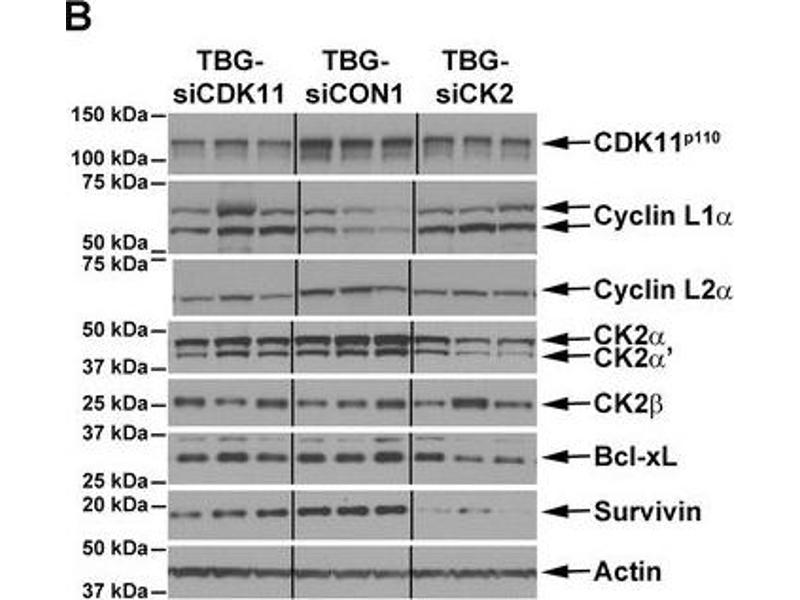 Background: Cyclin L (also referred to as CCNL) is encoded by two highly related genes Cyclin L1 and Cyclin L2 (CCNL1 and CCNL2, respectively). Cyclin L2 can be alternatively spliced to produce two isoforms (known as 1 and 2 or alpha and beta). The Cyclin L2 gene is located approximately 100-200 kb from the PITSLRE/CDK11 protein kinase locus in human (1p36) and in a syngenetic location on mouse chromosome 4q. Cyclin L2 is ubiquitous, expressed at much higher levels than Cyclin L1, and thus is likely the major partner for the CDK11p110 protein kinase.