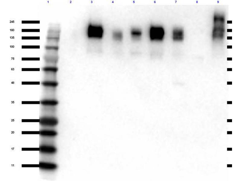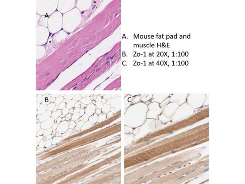 Anti-ZO-1 Antibody has been tested in Western Blot, ELISA, Immunohistochemistry, Immunofluorescence, and Flow Cytometry. Expect a band at ~245 and/or 195.5 kDa in western blot using appropriate lysates. Positive control whole cell lysates used A549 and PC3 @ 1μg/mL for WB, CACO2 and PC3 with PFA and MeOH @ 10μg/mL for IF. Positive control cells for FC were PC3 and positive control tissues for IHC was mouse adipose tissue.