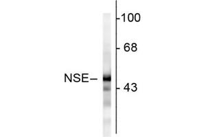 Background: NSE antibody detects NSE protein. Neuron specific enolase (NSE) is an enzyme which catalyzes the conversion of 2-phosphoglycerate to phosphoenolpyruvate in the glycolytic pathway, and also the reverse reaction in gluconeogenesis. It is one of three mammalian enolases, which are also known as ENO1, ENO2, and ENO3 or alternately as enolase alpha, beta and gamma. The three enolases have different cell type specific expression patterns, so that antibodies to them are useful cell type specific markers. NSE corresponds to ENO2 or enolase gamma and is heavily expressed in neuronal cells. ENO1 is also known as enolase alpha and as non-neuronal enolase. The third enolase, ENO3 or enolase beta, is expressed in muscle cells. Since neurons require a great deal of energy, they are very rich in glycolytic enzymes such a GAPDH and NSE. Antibodies to this protein are therefore useful to identify neuronal cell bodies, developing neuronal lineage and neuroendocrine cells. Release of NSE from damaged neurons into CSF and blood has also been used as a biomarker of neuronal injury. Anti-neuron specific enolase (NSE) antibody is ideal for investigators involved in Cell Signaling, Neuroscience, and Signal Transduction research.