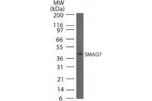 - SMAD7 Antibody was produced from whole rabbit serum prepared by repeated immunizations with SMAD7 peptide.