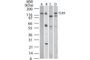 Anti-TLR9 Antibody is tested for use in WB, DB, ELISA, Flow, Flow-IC, ICC/IF, IHC, IHC-P, and IP. Expect a band approximately 113kDa on specific lysates. Specific conditions for reactivity should be optimized by the end user.