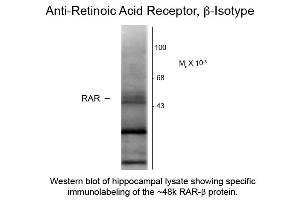 Anti-Retinoic Acid Receptor beta antibody is tested for use in Western Blotting to detect a single band at approximately 48 kDa corresponding to expected molecular weight for RAR-β proteins in the appropriate cell lysate or extract. Researchers should determine optimal titers for applications that are not stated below.