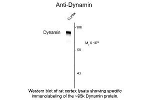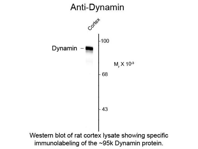 Anti-Dynamin Antibody is tested for use in ELISA and Western Blotting. Specific conditions for reactivity should be optimized by the end user. Expect a band of approximately 95 kDa in size corresponding to the dynamin proteins in the appropriate cell lysate or extract.