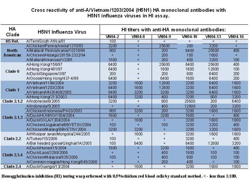 - Hemagglutinin of A/Vietnam/1203/04 Influenza Virus (VN04-9) monoclonal antibody was produced by intraperitoneal immunization of BALB/c mice with concentrated purified virus preparation containing hemagglutinin (HA) protein of influenza A virus [strain A/Vietnam/1203/04 (H5N1)] using the modification of the method described by Kohler and Milstein. Each mouse received two immunizations of 15 mug HA with incomplete Freund's adjuvant, administered 3 week apart.