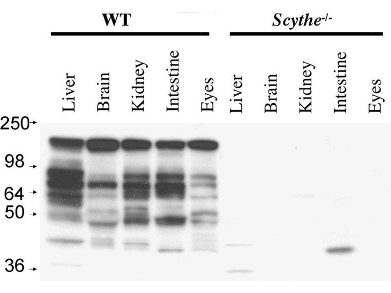 This polyclonal antibody has been tested for use in western blotting and is specific for mouse Scythe/Bat3 and its isoforms. Specific conditions for reactivity should be optimized by the end user. Expect multiple bands, with the predominant at approximately 200kDa in size corresponding to Scythe/BAT3 by western blotting in the appropriate cell lysate or extract. In western blot analysis of endogenous protein, multiple bands of Scythe/BAT3 may appear corresponding to variable amount of splice isoforms present.