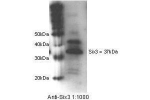This Protein A purified antibody has been tested for use in Immunohistochemistry, immunofluorescence microscopy, dot blot, and western blotting. Specific conditions for reactivity should be optimized by the end user. Expect a band approximately 37 kDa in size corresponding to Six3 by western blotting in the appropriate cell lysate or extract. -