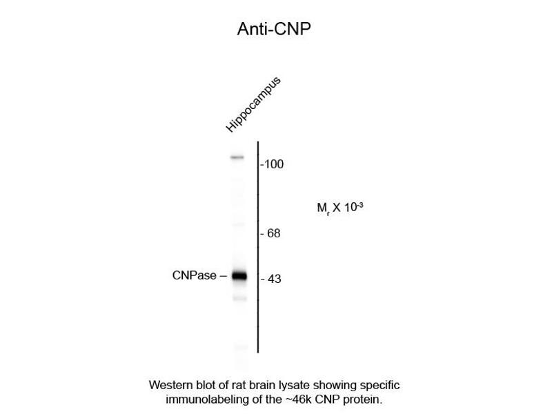 Anti-CNP has been tested in western blot and IHC and is suitable for usage in ELISA. Specific conditions for reactivity should be optimized by the end user. Expect a 46kDa band by western blot corresponding to CNP protein in the appropriate cell lysate of tissue.