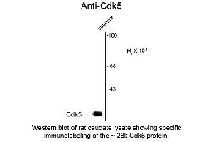 Anti-CDK5 (Mouse) has been tested for use in Western Blotting and is excellent for use in IHC. Specific conditions for reactivity should be optimized by the end user. Expect a band of ~28kDa in size in rat striatal lysates by Western Blotting. Anti-CDK5 antibodies also work well for immunocytochemistry using primary cultured rat neurons and for immunohistochemistry on mouse brain tissue. -