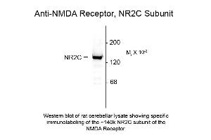 Anti-NMDA R2C Antibody is tested for use in Western Blotting and Immunoprecipitation and suitable for IHC and IF. Specific conditions for reactivity should be optimized by the end user. Expect a band of approximately 140 kDa in size corresponding to the NR2C subunit of the NMDA receptor. This antibody also labels the approximately 180 kDa NR2A and NR2B subunits of the NMDA receptor.