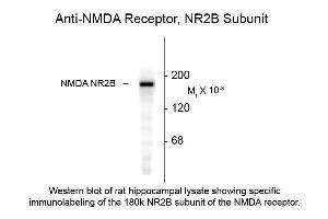 Anti-NMDA R2B Antibody has been tested in Western Blotting. Expect a band of approximately 180kDa in size corresponding to the NR2B subunit of the NMDA receptor in appropriate cell lysate or extract. A dilution of 1:1000 is recommended in western blotting although specific conditions for reactivity should be optimized by the end user.