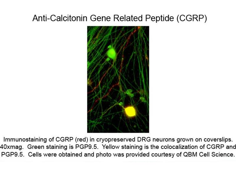 Background: CGRP antibody recognizes Calcitonin Gene Related Peptide or CGRP which is a 37 amino acid peptide and is the most potent endogenous vasodilator currently known. CGRP is primarily produced in nervous tissue, however, its receptors are expressed throughout the body. CGRP is also strongly implicated in the vasodilatory effect of endogenous cannabinoid anandamide in the brain. This effect was found to be antagonized by capsazepine. CGRP is also currently a major target of research in regards to factors effecting the onset of migraine headaches. CGRP antibodies have been used successfully in immunoneutralization. Anti-CGRP antibody is ideal for investigators involved in Cell Signaling, Neuroscience, Signal Transduction research.
