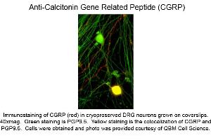 Anti-Calcitonin Gene Related Peptide antibody has been tested by ELISA and ICC. This product is not recommended for use in Western Blotting. Specific conditions for reactivity should be optimized by the end user. Suggested positive controls are dorsal root ganglia, pancreas and gut. -