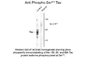 Anti-Tau pS416 (Rabbit) antibody is tested for use in Western Blot and IHC. Expect bands approximately 59, 65, 68 kDa in size corresponding to tau proteins phosphorylated at Ser416 in the appropriate cell lysate or extract. Researchers should determine optimal titers for applications that are not stated below.